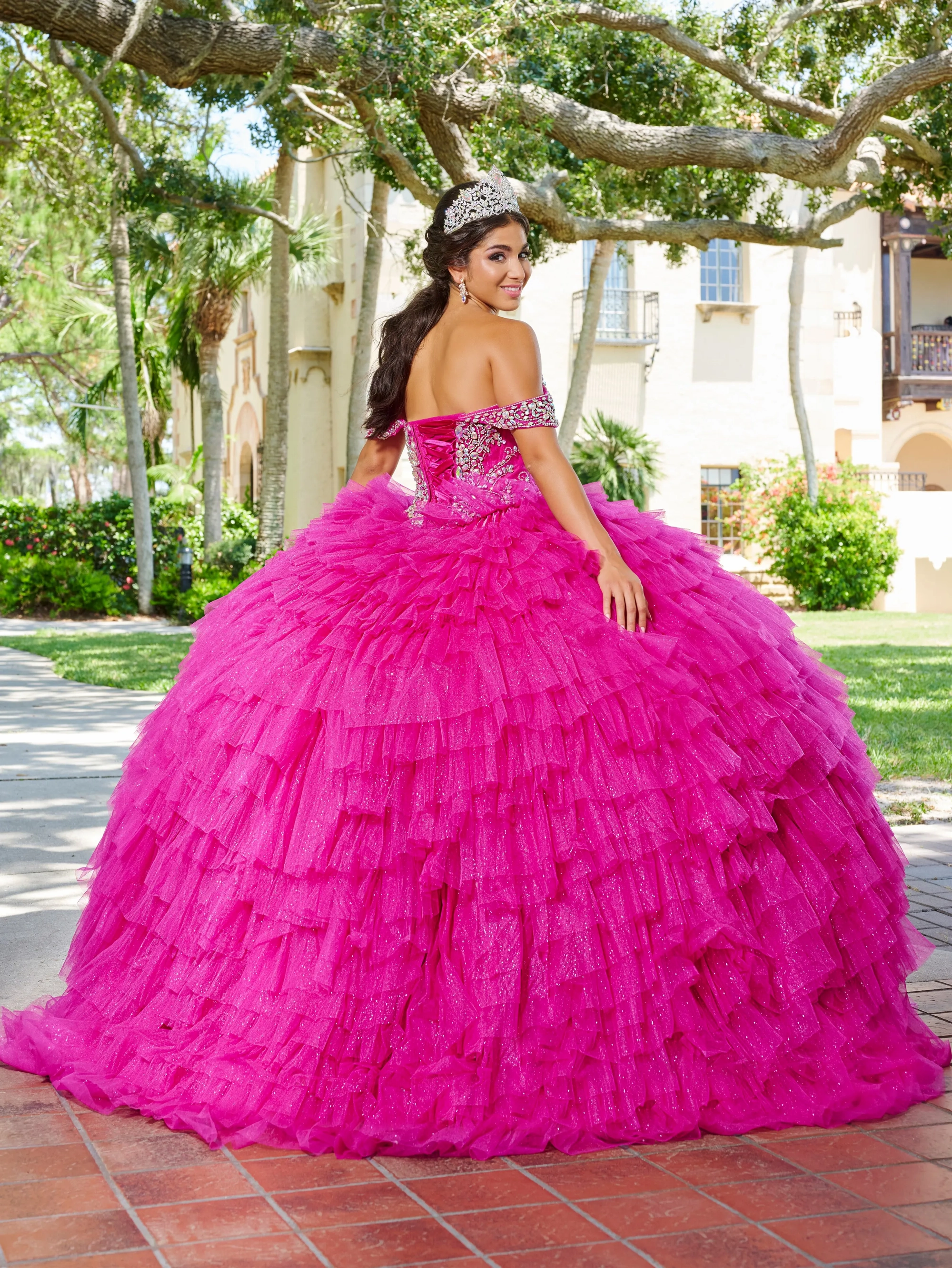 Sweetheart off the shoulder neckline, large AB rhinestone beaded bodice. Multiple layers of ruffle ball gown skirt. Lace-up with sweep train.