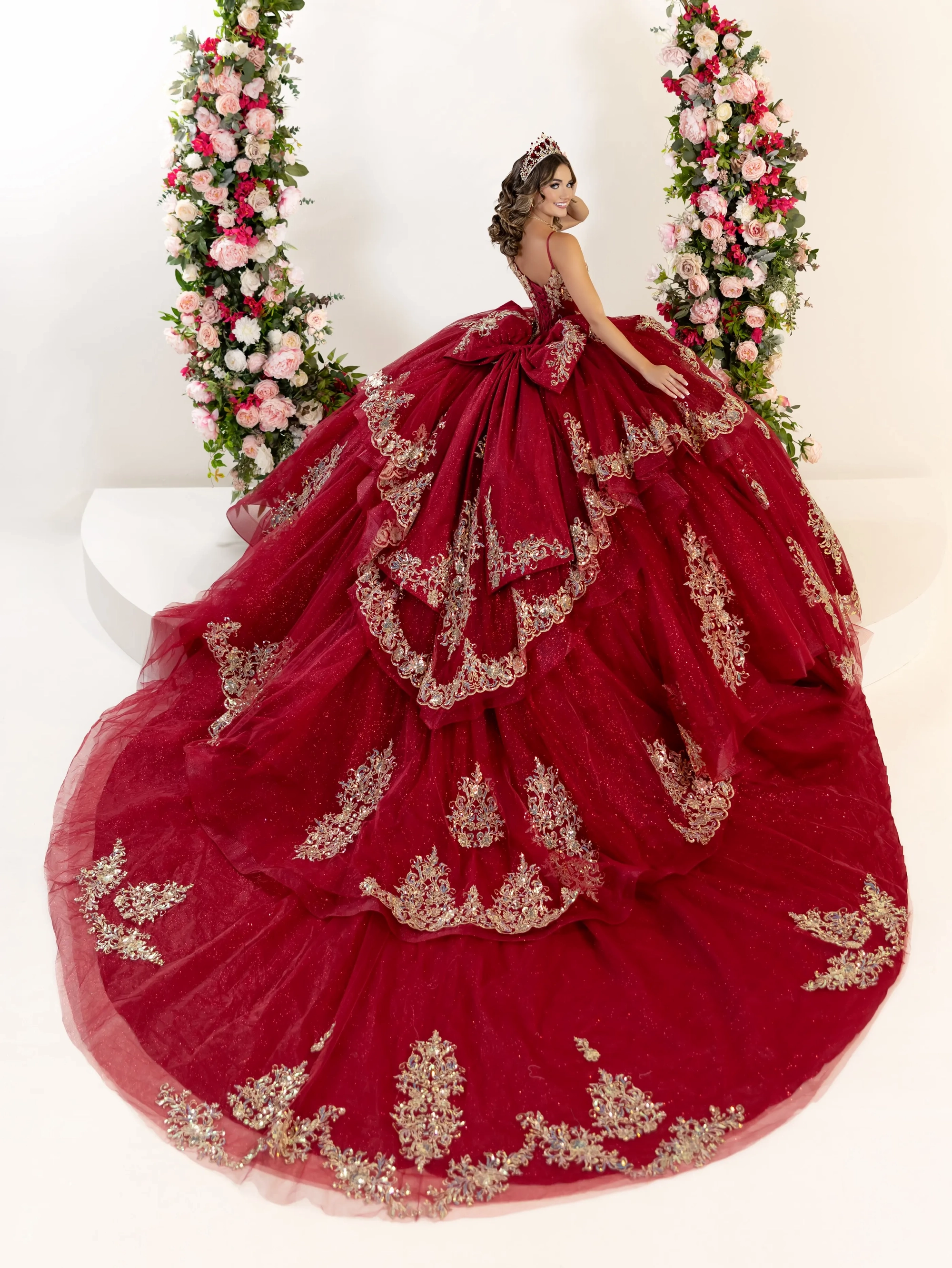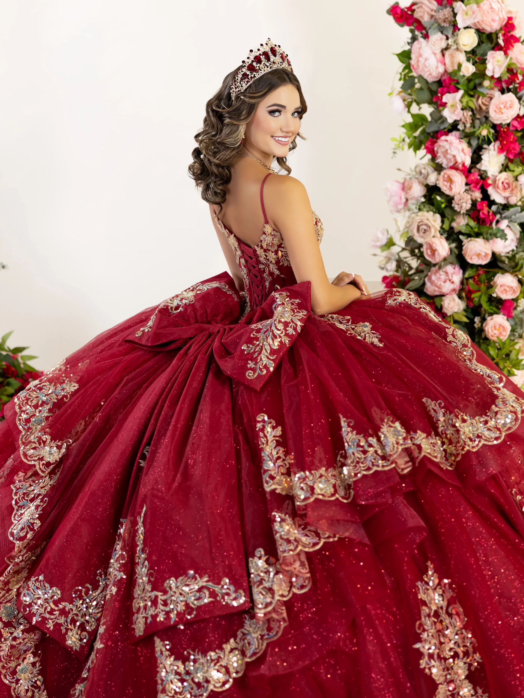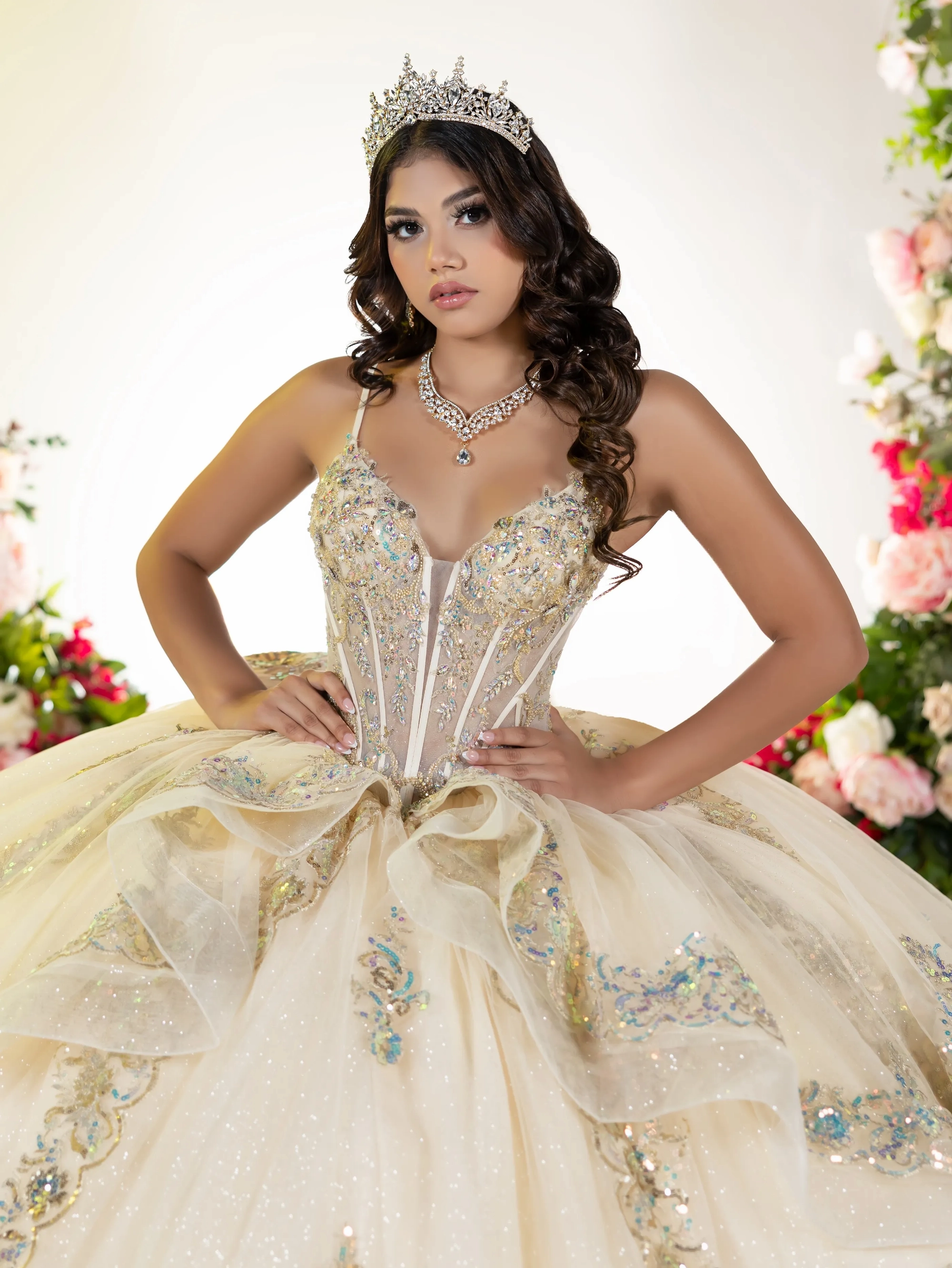 Regal and radiant, this gown features a sophisticated deep sweetheart neckline with delicate straps that offer elegance and support. The fitted bodice is richly detailed with gold metallic embroidery and beadwork, creating ornate vertical patterns that elongate the torso and draw attention to the cinched waist. A striking peplum accent at the waist adds extra drama before the voluminous tulle skirt billows out. The full skirt is covered in glittering gold appliqués, arranged in bold baroque-inspired motifs that give the gown a royal, museum-worthy finish. The back of the dress is a true statement—featuring layered scalloped tulle panels adorned with gold embroidery that cascade beautifully from a structured bow at the waist. The glittery tulle train extends into a dramatic sweep, framed by gold detailing that mirrors the front for a cohesive, luxurious look. A low scoop back complements the silhouette while adding just a touch of allure to the classic style.