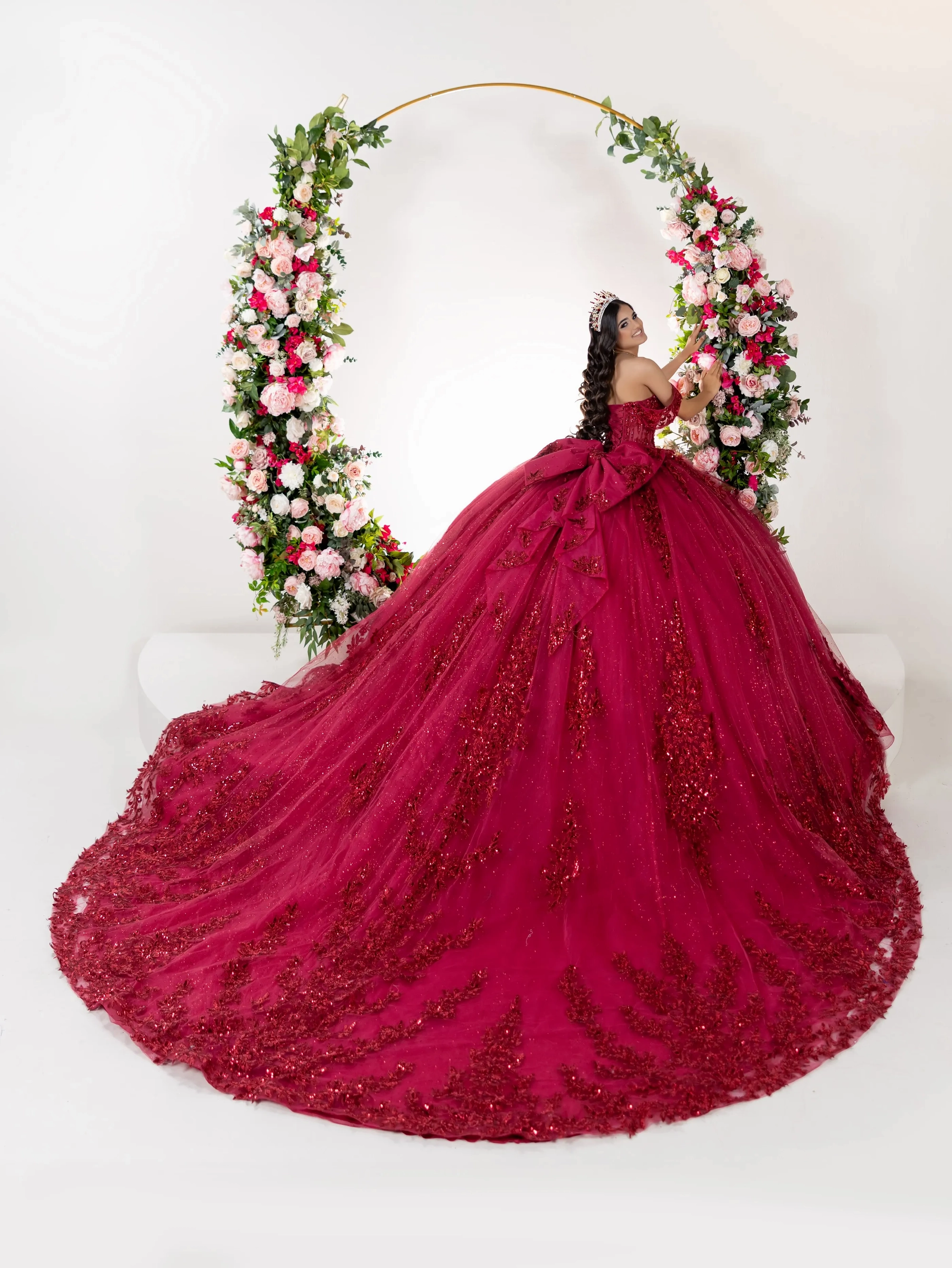 Of- the-shoulder neckline, with delicate touch of silver embroidery lace. Voluminous skirt. Crafted from layers of shimmering tulle and sparkle tulle underneath.