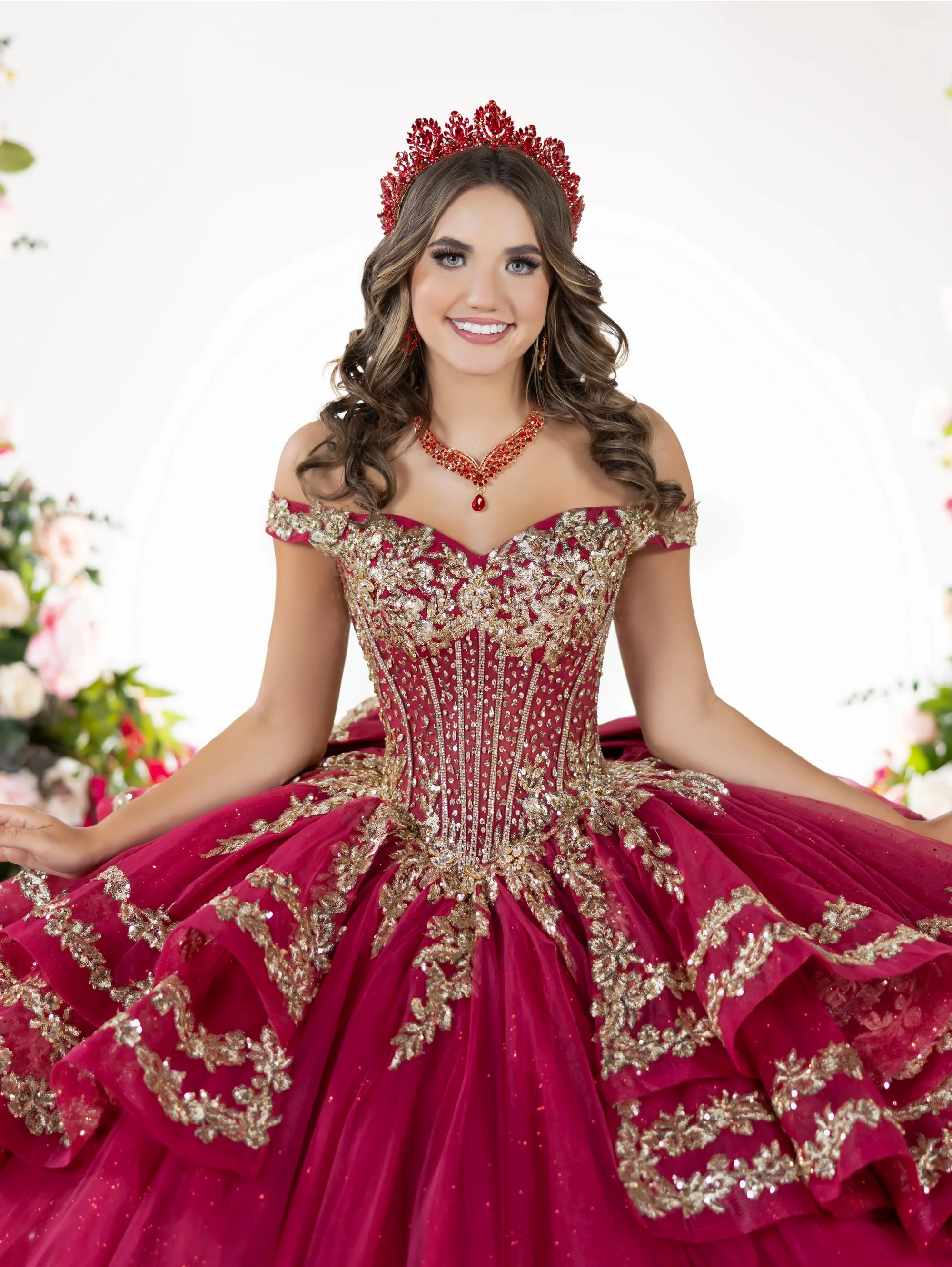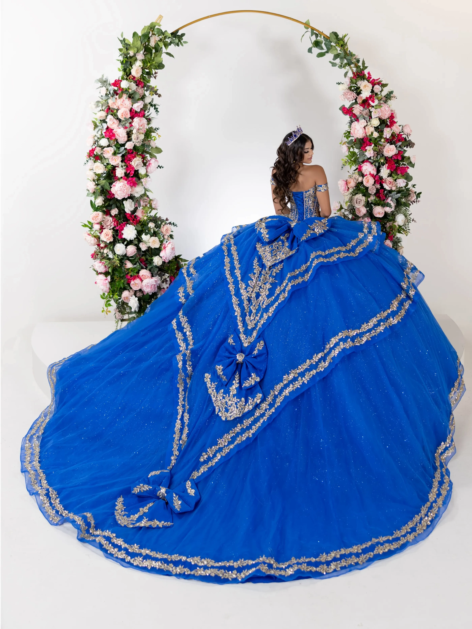 The off-the-shoulder neckline ball gown is accented with gold embroidery beaded lace and structured corset bodice, the voluminous tulle skirt features tiered, scalloped overskirts edged with gold embroidery beaded lace throughout out this semi-cathedral train.
