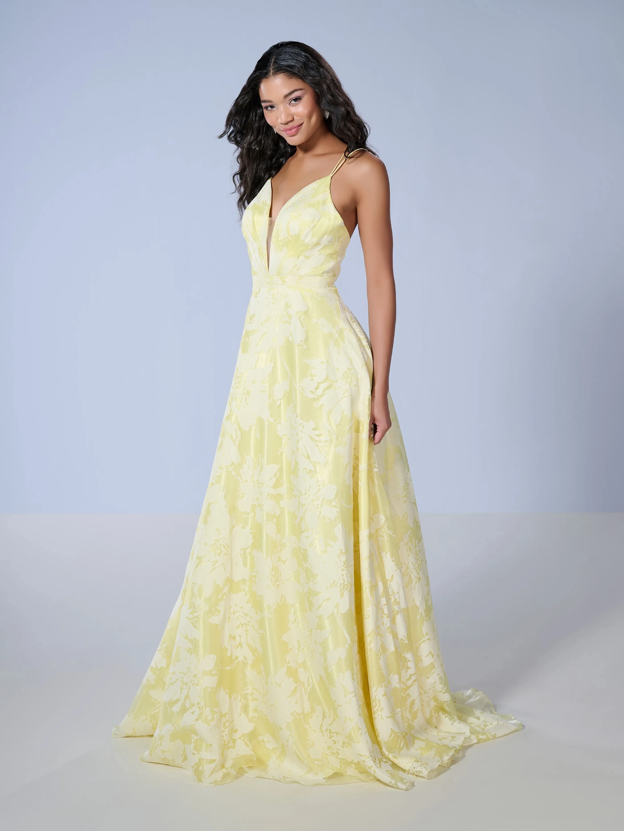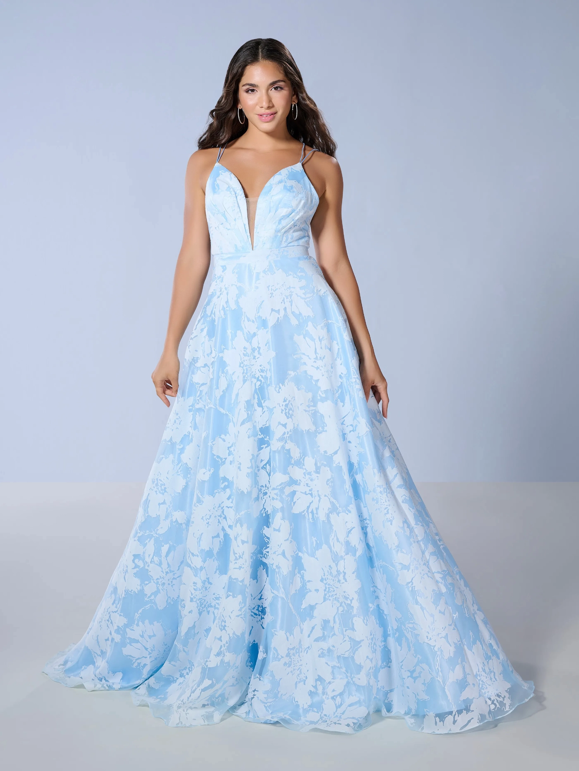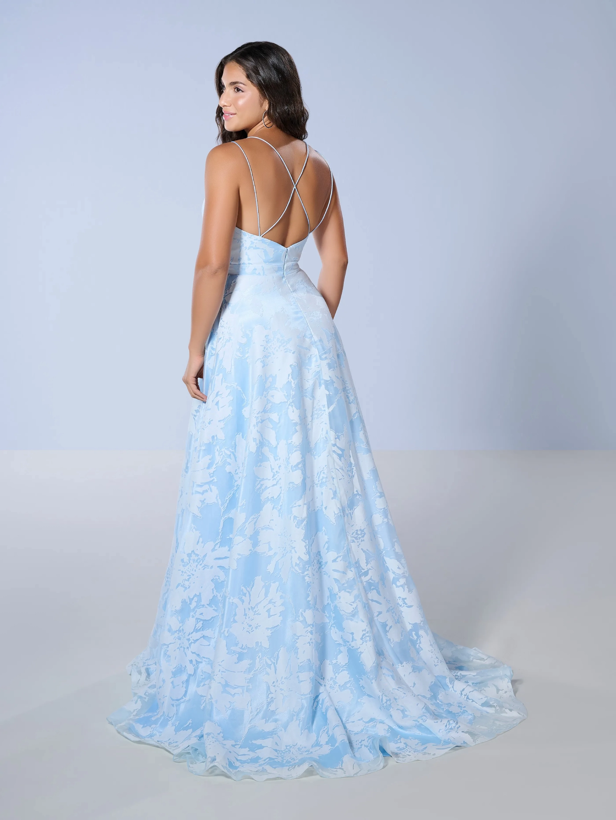 A soft beautiful A-line gown made out of shadow floral soft organza with a beautiful v neckline. To add a bit more elegant this gown also has a slight train.