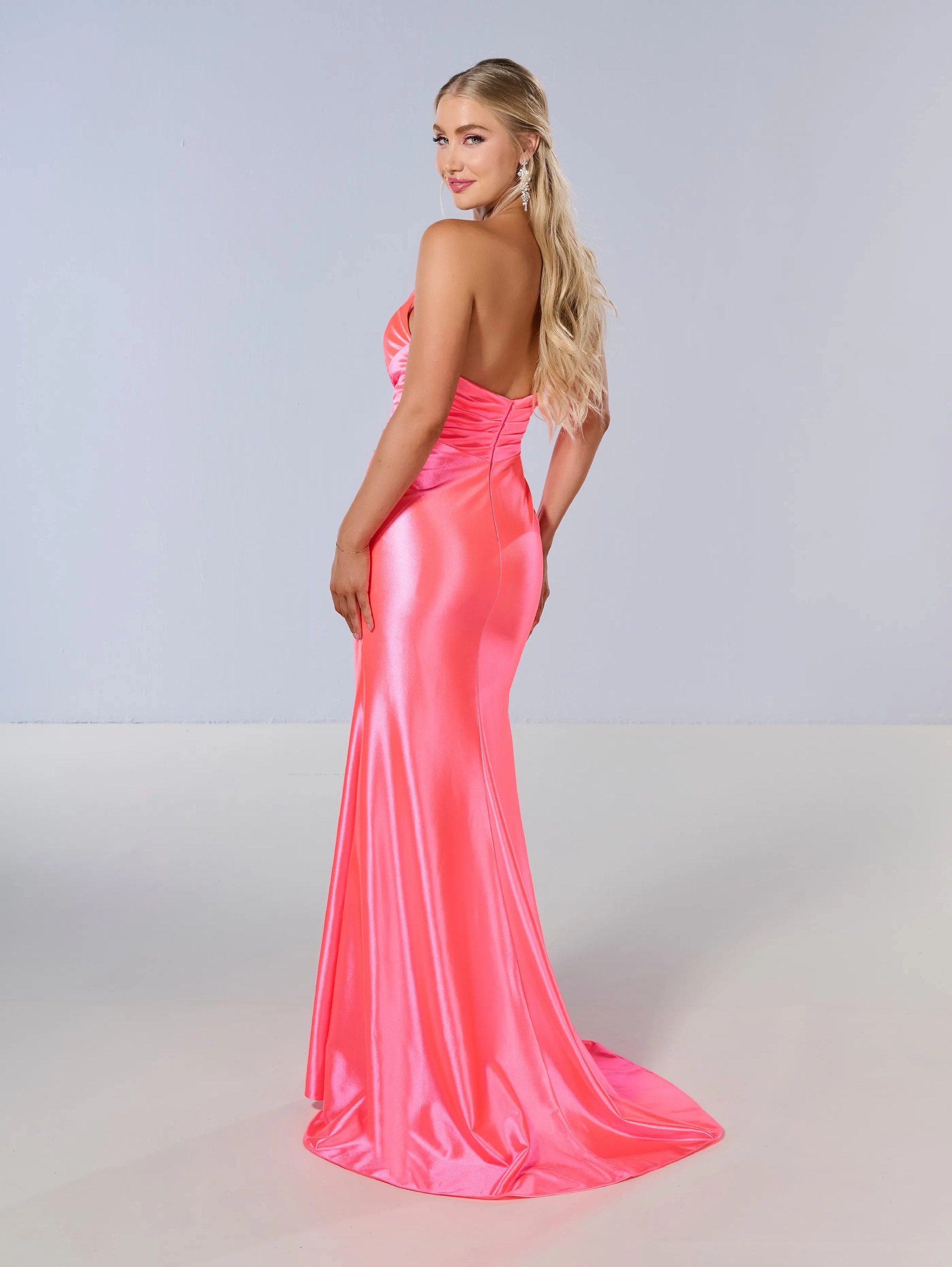 This is a beautiful fit and flare gown made out of shiny stretchy jersey material topped off with a flawless sweetheart sleeveless neckline.