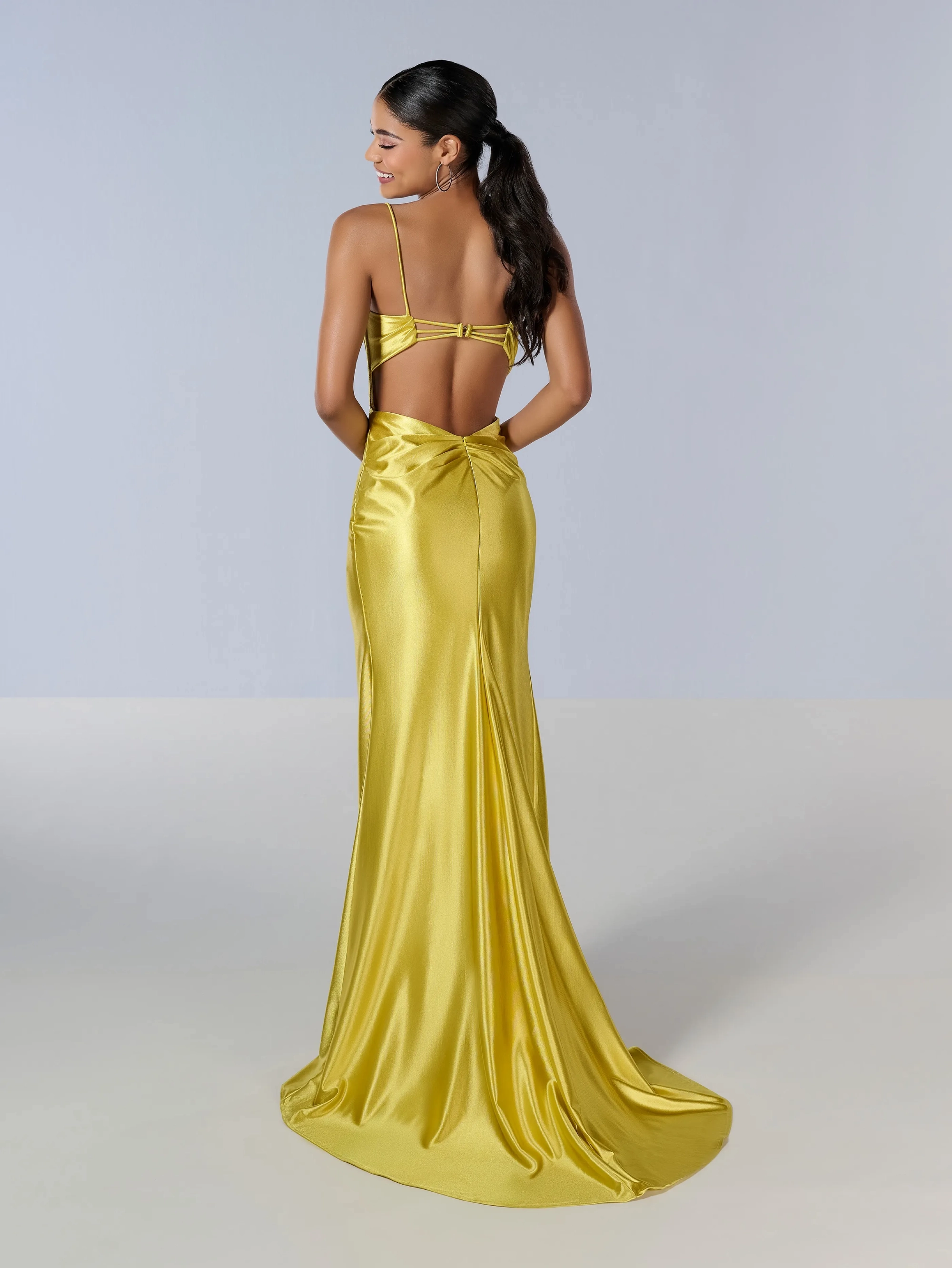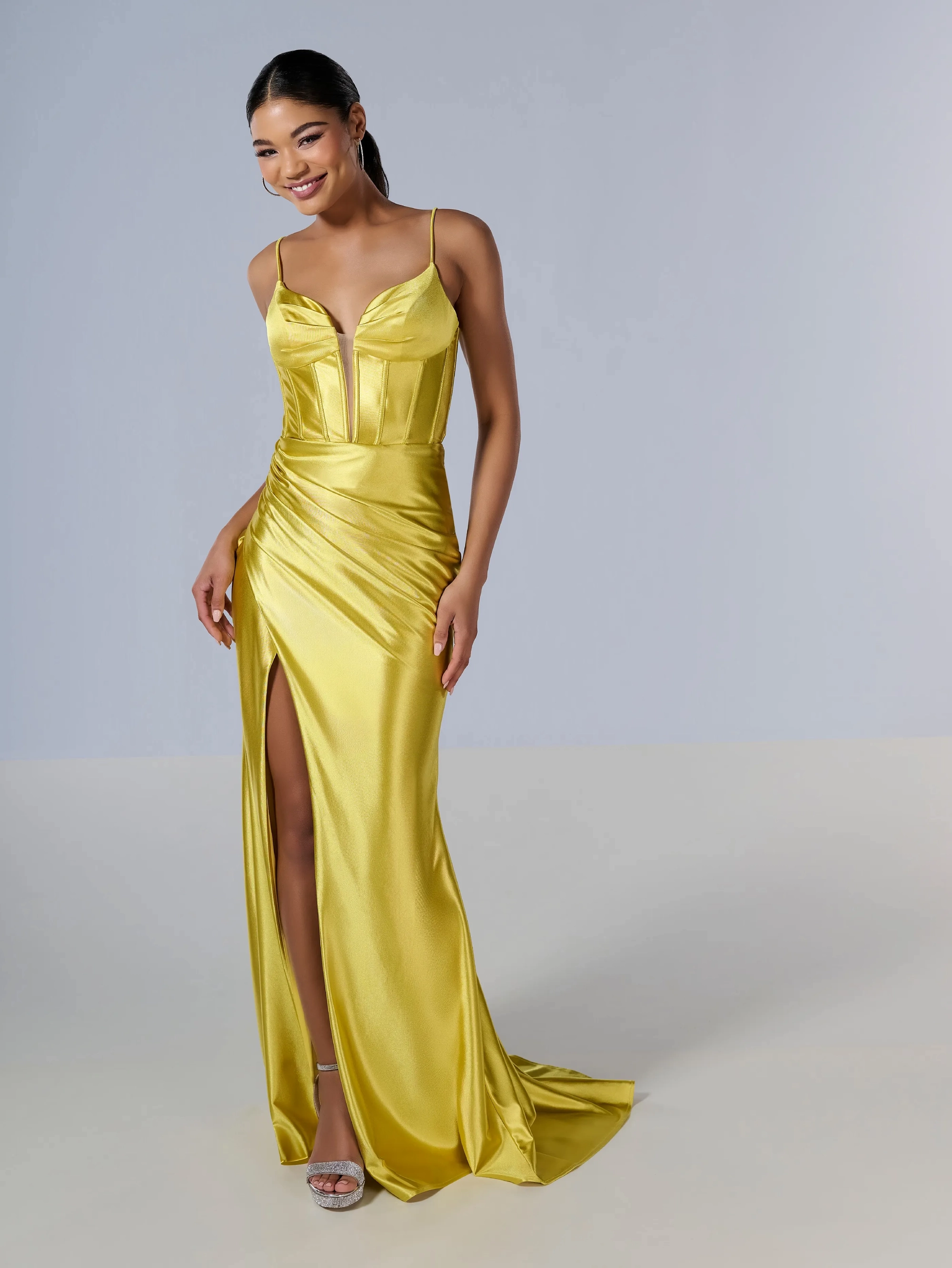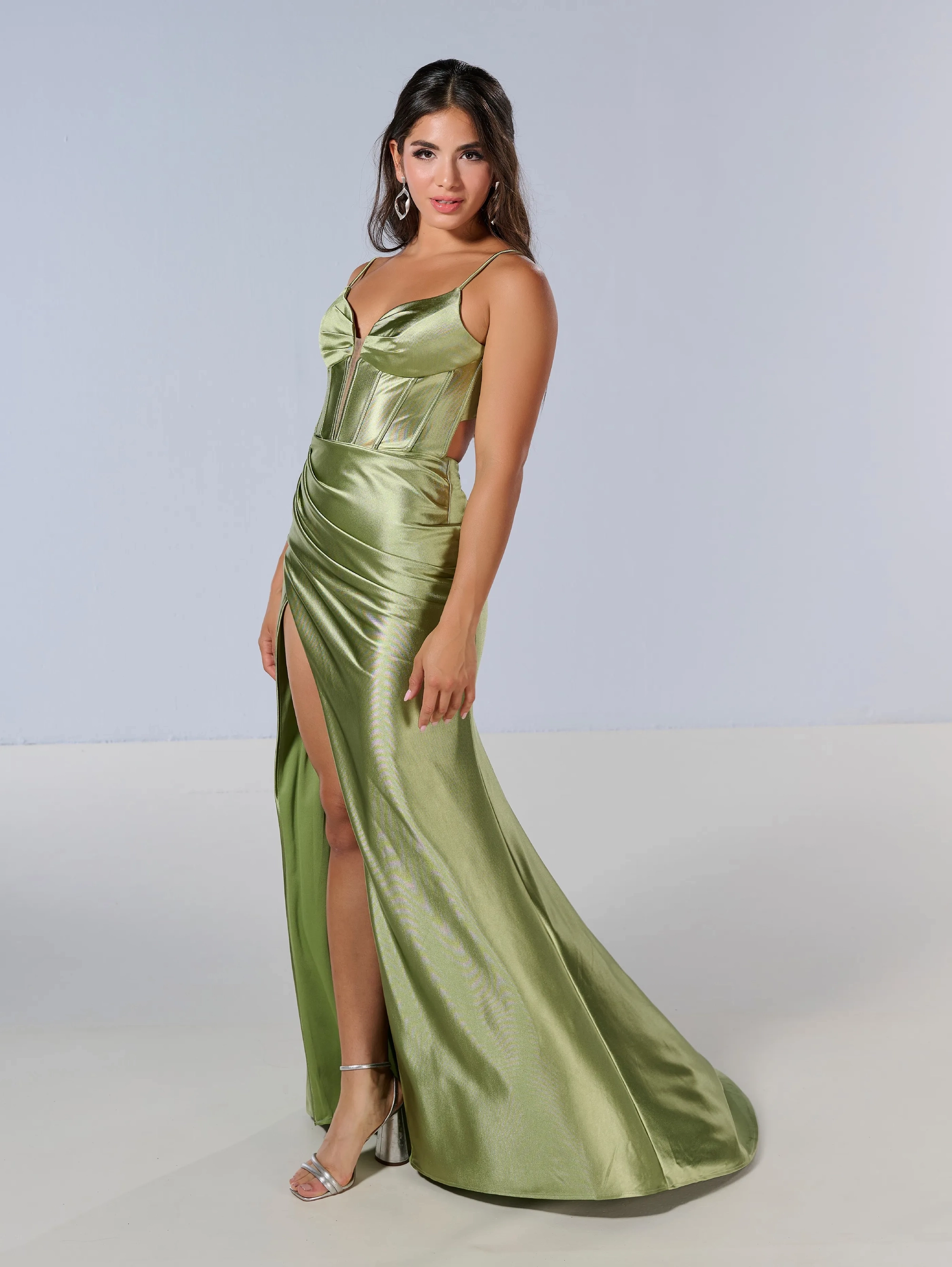 This unique fit and flare gown made out of shiny stretchy jersey material has a deep V illusion neckline, and a flawless slight train.